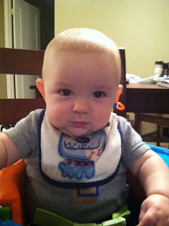 Weston has started eating solid foods! Although he is only 5 months, his pediatrician recommended that we try it since he is so big and not sleeping very well at night. I didn't think it would make much of a difference if we fed him, and it hasn't so far, but Wes sure does enjoy his rice cereal. We have also tried oatmeal and bananas, he wasn't a fan of either...but I think it may just be the texture. We will try again in a while. Here is a picture of his first food tasting: